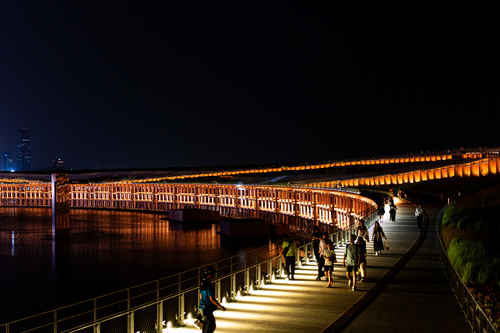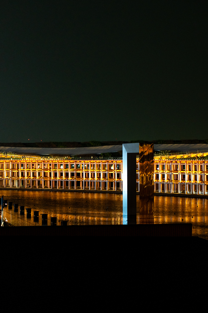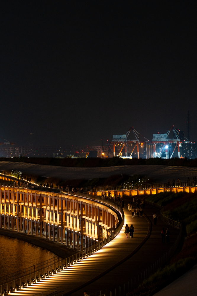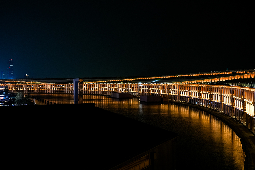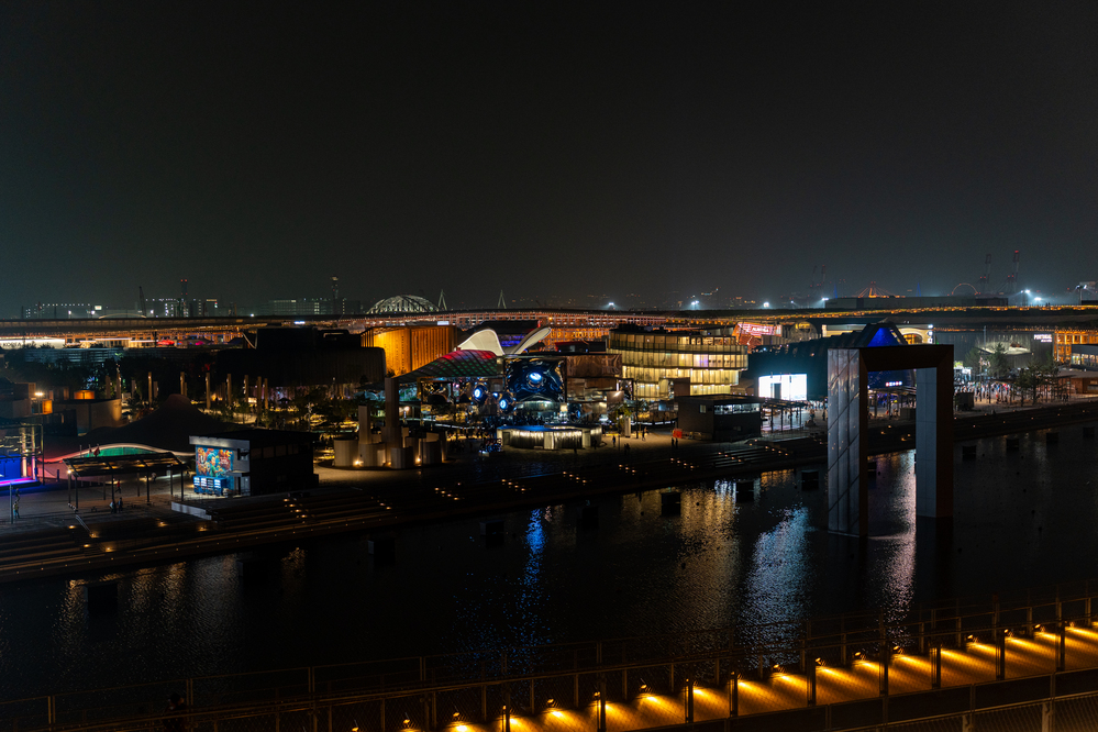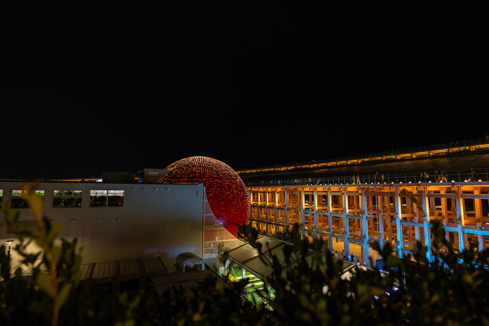時間があれば、19:00以降は先着入場となる日本館や、日本館のお隣のEXPOホールに映し出されるプロジェクションマッピングにも行きたかったのですが、イタリア館を出た時はすでに20:15ごろ。さすがにこれ以上のパビリオン見学は諦め、ライトアップされているパビリオンの撮影、そして、大屋根リングを端から端まで半周歩きながら、万博の夜景をのんびりと楽しむことにしました。